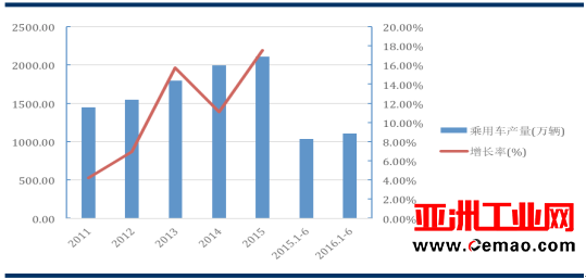 2015 年,全國汽車產銷量分別為 2,450 萬輛和 2,460 萬輛, 同比增長 3.29%和 4.68%。其中,乘用車產銷量分別為 2,108 萬輛和 2,114 萬輛,同比增長 5.82%和 7.30%;商用車產銷量分別為 342 萬輛和 345 萬輛,同比下降分別為 9.97%和 8.97%。 2016 年上半年,全國汽車產銷量分別為 1,287 萬輛和 1,279 萬輛,同比增長 6.41%和 8.10%。其中,乘用車產銷量分別為 1,108 萬輛和 1,101 萬輛,同比增長 7.25%和 9.23%;商用車產銷量分別為 179 萬輛和 179 萬輛,同比下降分別為 1.53%和 1.62%。2011 年至 2016 年 1-6 月乘用車產量及增長率情況如下:
