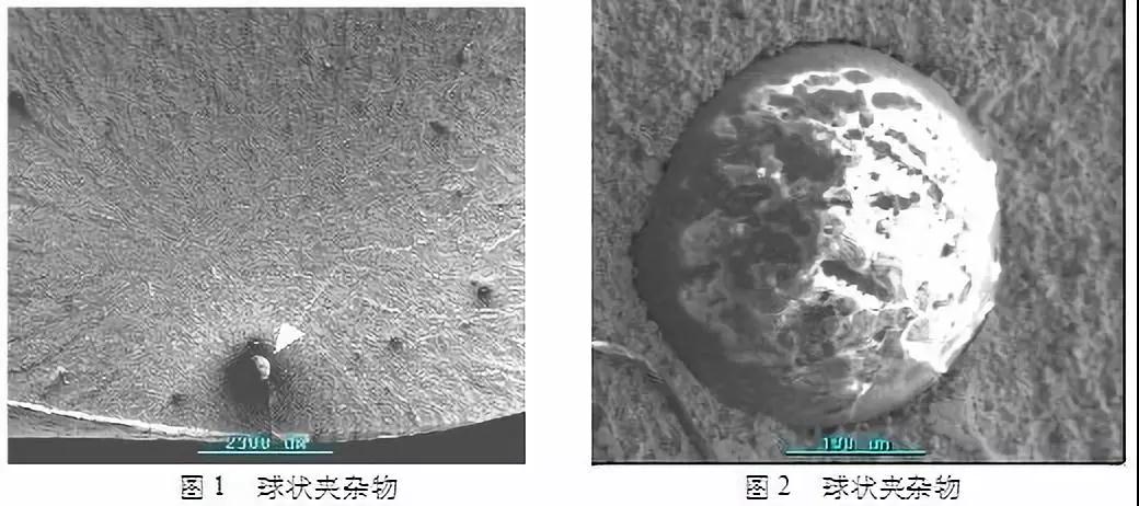 實(shí)例:某公司一件型號(hào)為SY6480(Ф22mm)的車輛懸架用扭桿彈簧,在新車出庫(kù)時(shí)便發(fā)生斷裂,分析認(rèn)為斷裂起源于彈簧亞表面存在的一個(gè)粗大脆性?shī)A雜物(如圖1,圖2(圖1的放大圖))。