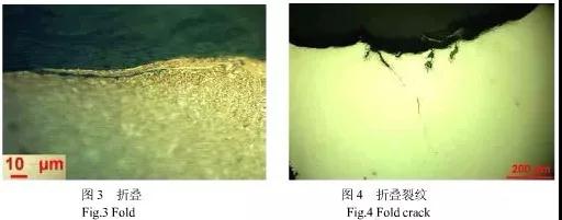 2、軋制過(guò)程可能引起的缺陷:殘余縮管及中心裂紋;折疊缺陷(如圖3);線狀缺陷、劃痕;表面銹蝕坑;過(guò)燒、桔皮狀表面、麻坑;這些都可能導(dǎo)致彈簧失效。所以鋼廠應(yīng)盡量避免和消除軋制過(guò)程中產(chǎn)生的缺陷,彈簧廠應(yīng)加強(qiáng)對(duì)彈簧原材料質(zhì)量檢查,盡量采用表面質(zhì)量好的材料。