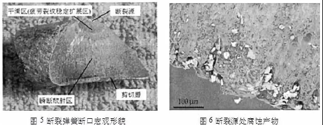 實(shí)例:對(duì)某電廠汽輪機(jī)主汽門操縱座彈簧的斷裂失效進(jìn)行了分析。結(jié)果表明:彈簧材料化學(xué)成分及組織都符合國(guó)家標(biāo)準(zhǔn),導(dǎo)致其早期疲勞斷裂的主要原因是彈簧表面的腐蝕坑(如圖5,圖6);腐蝕坑是在彈簧使用前的放置過(guò)程中形成的,改善彈簧放置環(huán)境和縮短放置時(shí)間可以避免腐蝕坑的產(chǎn)生。