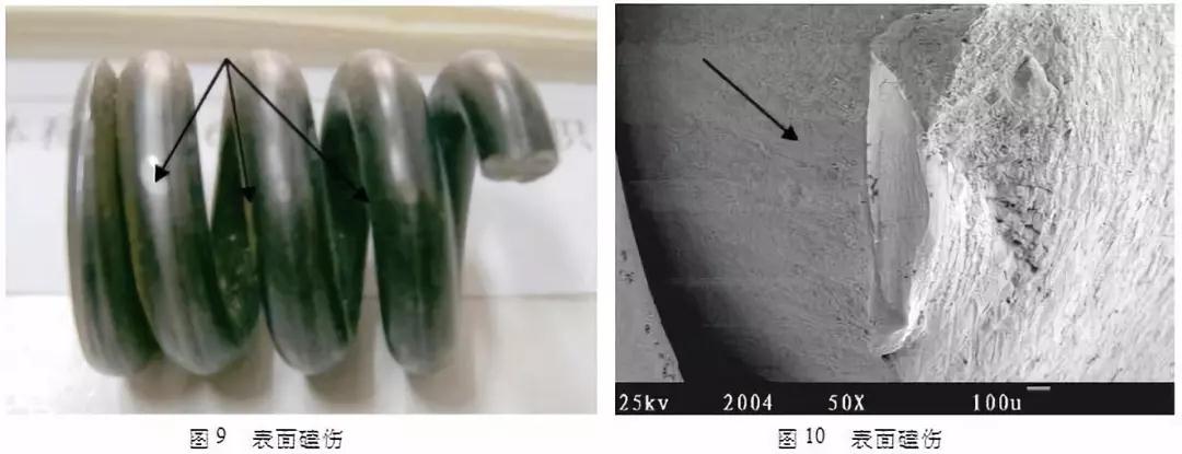 彈簧因?yàn)楸砻婵暮邸伎拥纫饛椈墒У那闆r很多,在失效件中占很大比例。如某公司離合器從動(dòng)盤彈簧由于彈簧表面存在的嚴(yán)重磕傷而導(dǎo)致它過(guò)早疲勞斷裂(如圖9,圖10)。這種表面缺陷可能發(fā)生在彈簧制造過(guò)程中,也可能在使用過(guò)程中磕碰產(chǎn)生,制造過(guò)程前面已述,而在使用過(guò)程,使用者要檢查使用環(huán)境,避免彈簧受碰撞等。